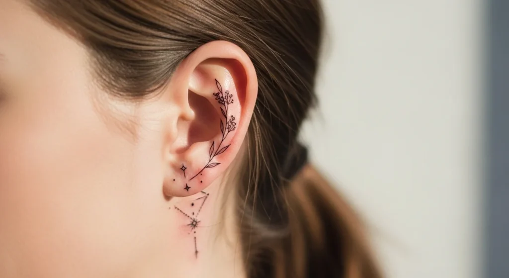 Behind-the-ear tattoos have become a favorite for women who want something small, elegant, and easy to hide. This placement feels personal. You can show it off with a simple hairstyle or keep it hidden under your hair. Most designs stay minimal—thin lines, tiny symbols, and soft shapes that don’t overpower the space.