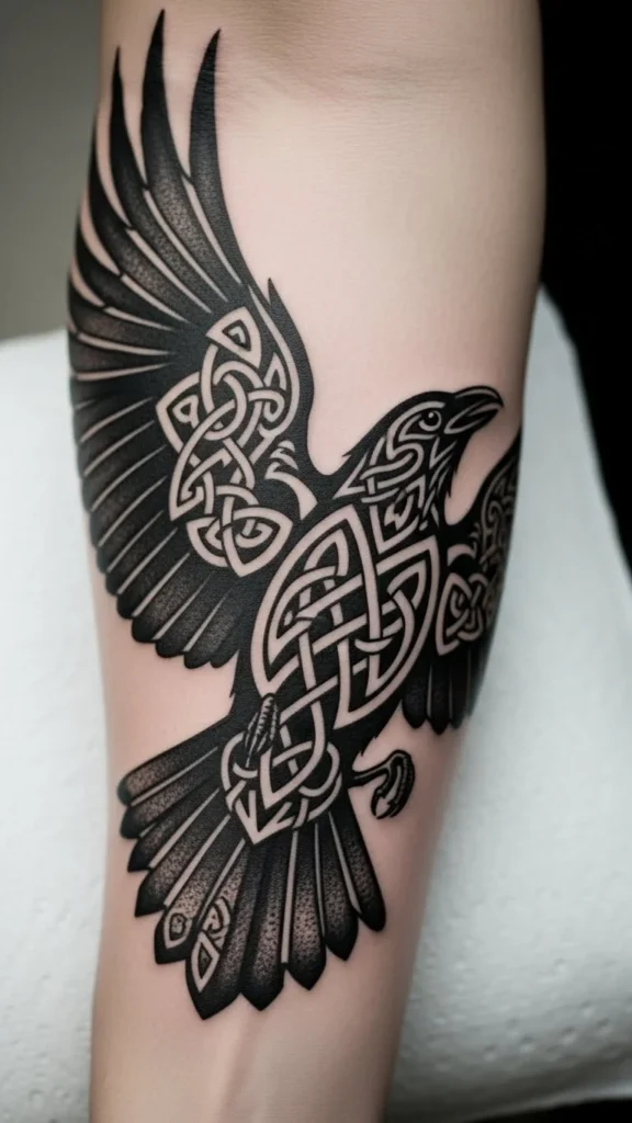 Ravens often reflect insight and guidance. Knotwork wings keep the style symbolic.