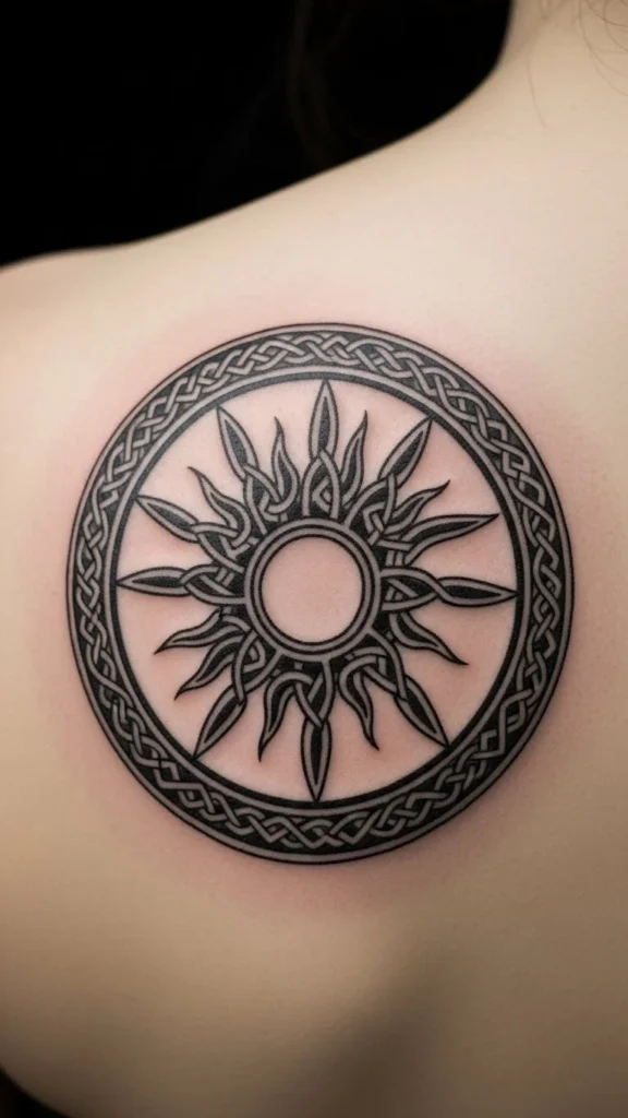 The sun wheel reflects cycles and renewal. Its round shape fills space evenly.