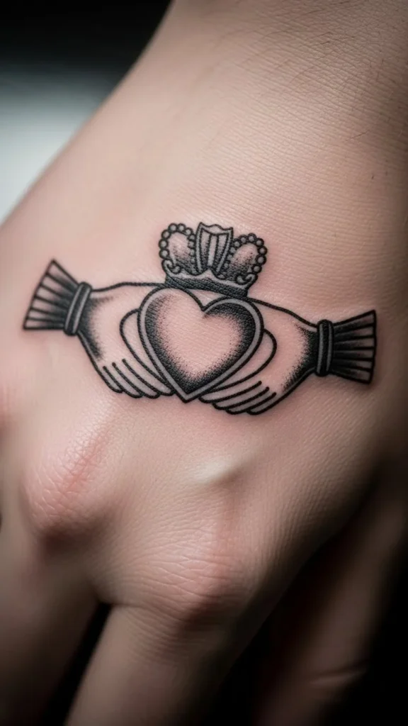 The Claddagh shows hands holding a heart topped with a crown. It often reflects loyalty and care within close relationships.