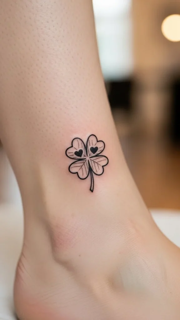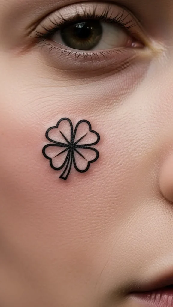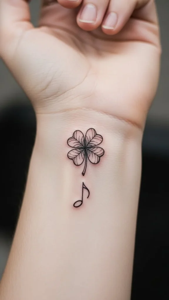 A shamrock with a tiny smile feels cheerful and friendly. Rounded leaves keep the design soft. This works well on wrists or ankles. Thin outlines help keep the tattoo quick and affordable. At home, sketch different face expressions on paper to see what feels right. Skip shading to keep the look simple. Keeping the smile small avoids crowding. This tattoo feels playful without becoming busy.