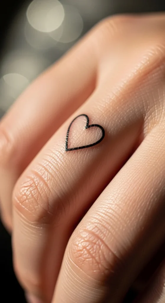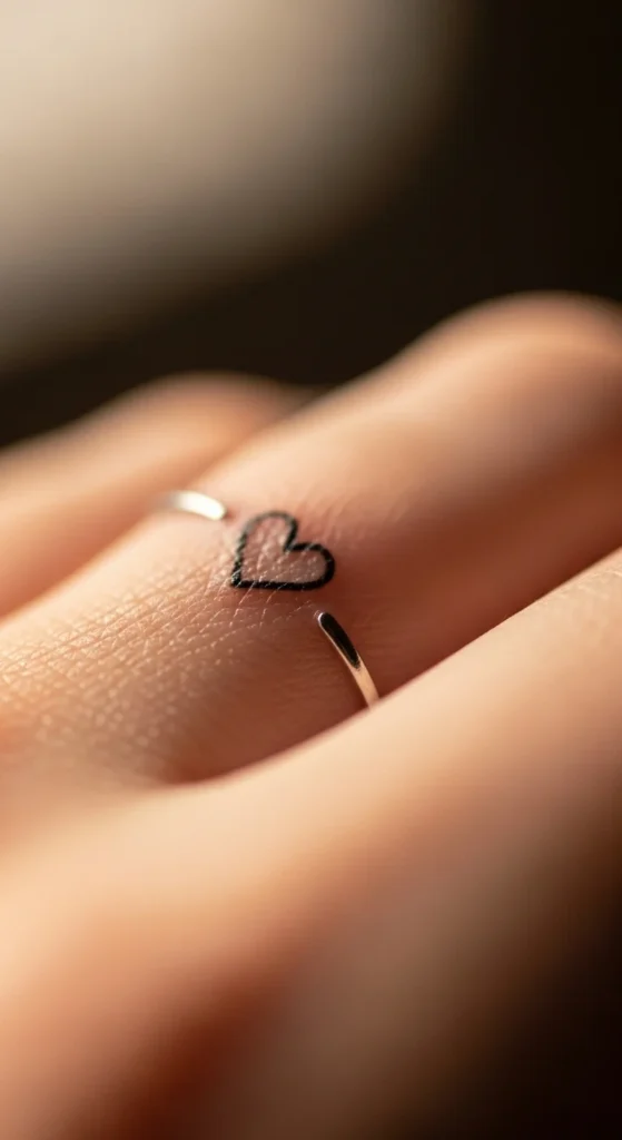 Placement on the ring finger makes it subtle yet visible. Black ink works best to resist fading. Try drawing the design with a pen first to test size. Small hearts can pair with dots or tiny symbols for a personalized touch. This is an easy, budget-friendly first tattoo idea.