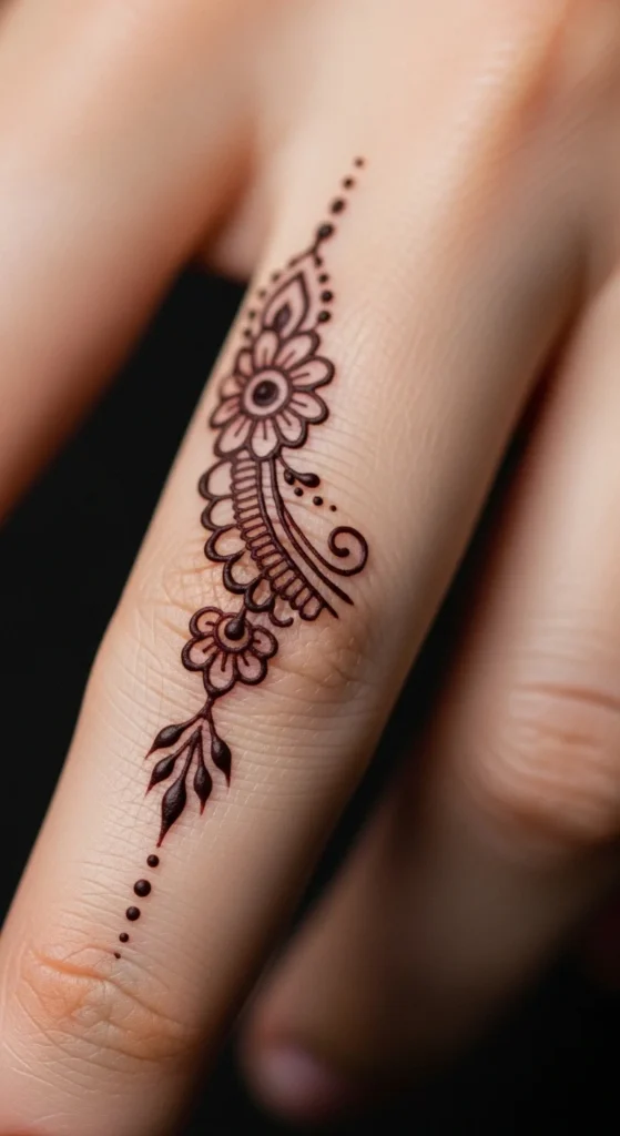 Side or base finger placement is ideal. Black ink ensures longevity. Pair with dots or leaves for a personalized motif. This design is edgy yet elegant, easy to maintain, and visually striking.