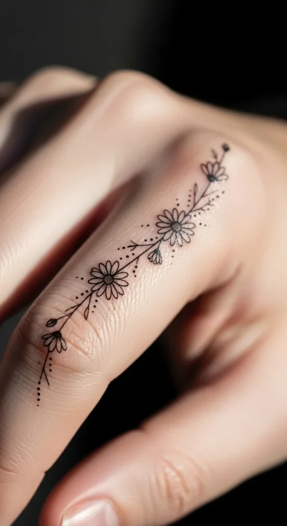 Daisies bring a playful, gentle energy. A line of tiny blooms along the finger creates a natural flow.