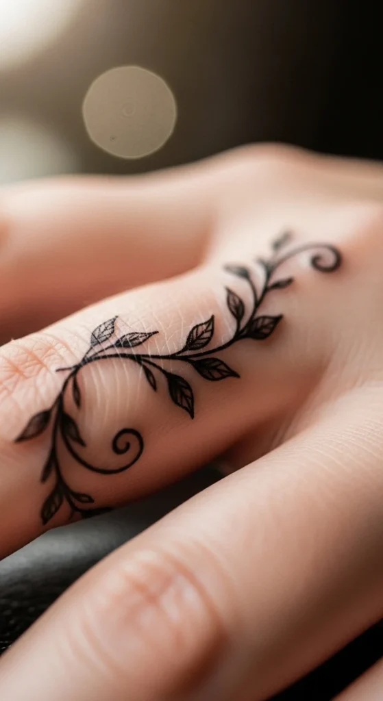 Vines represent growth and resilience. A small trail along the finger looks feminine and natural.