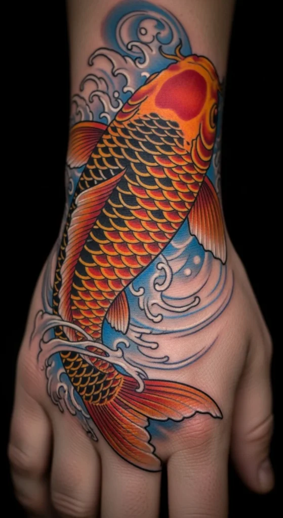 A koi curves naturally around the hand. That flow keeps the design dynamic. Choose soft gradients and skip tiny scales. Start small if you’re on a budget. You can always expand later.