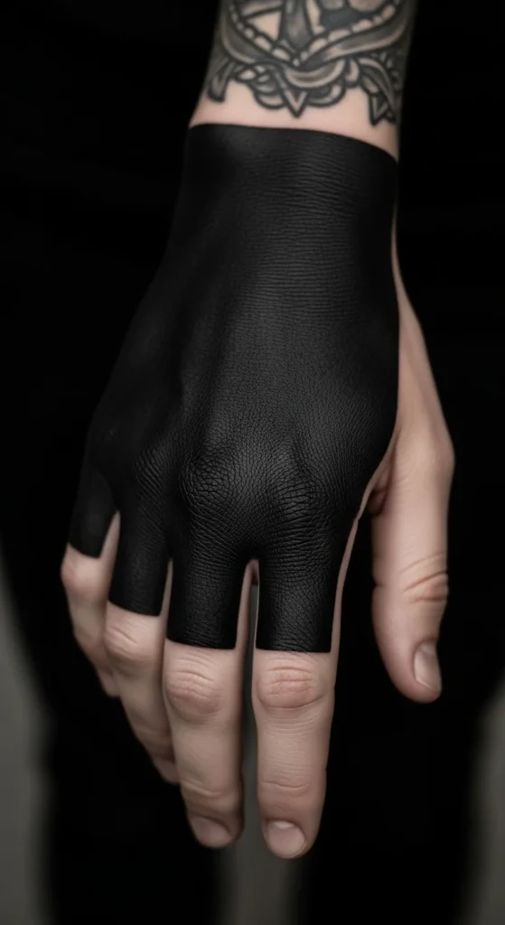 Blackout accents create strong contrast. You can block small sections instead of the whole hand. Great for covering older ink too.