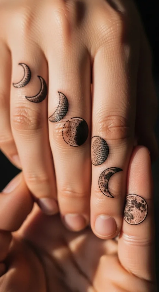 Moon phases line up nicely across fingers. Dot shading hides wear and tear. Simple and symbolic.