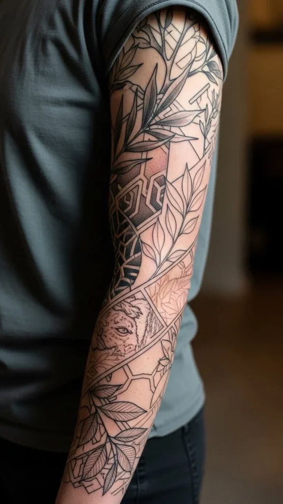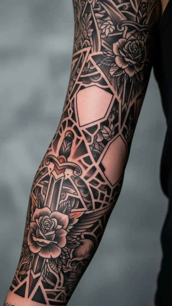 - Full sleeve: shoulder to wrist, bold and cohesive