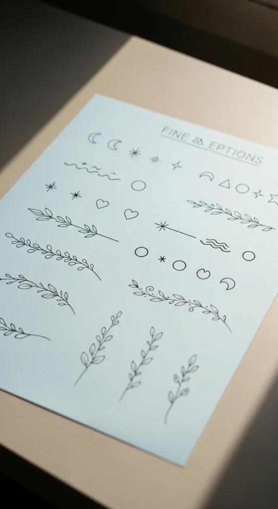 - Minimal symbols (tiny snake, butterfly outline, tiny flower)