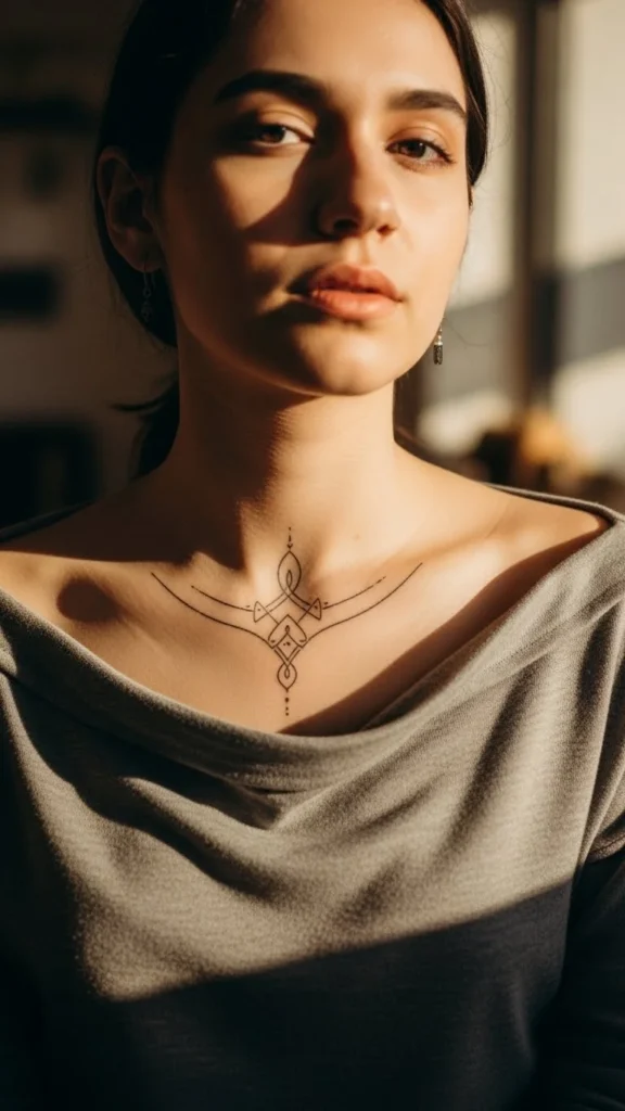 • Minimal necklaces that frame chest tattoos