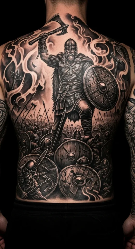 A Viking battle scene looks massive and fearless. It works best when the main warrior sits high between the shoulder blades so the face stays readable when you move.