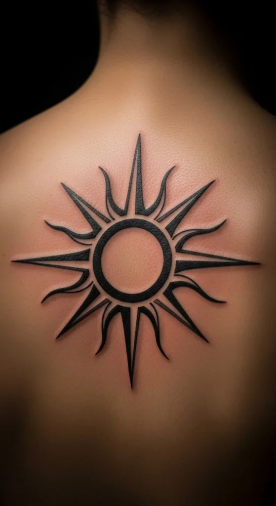 A tribal sun feels energetic and bold. It also works well as a single-session tattoo.