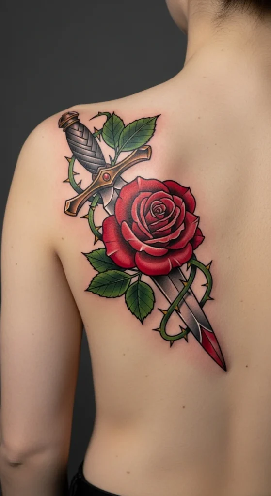 Rose and dagger is a clean symbol of contrast. It’s bold but not complicated.