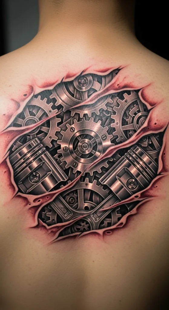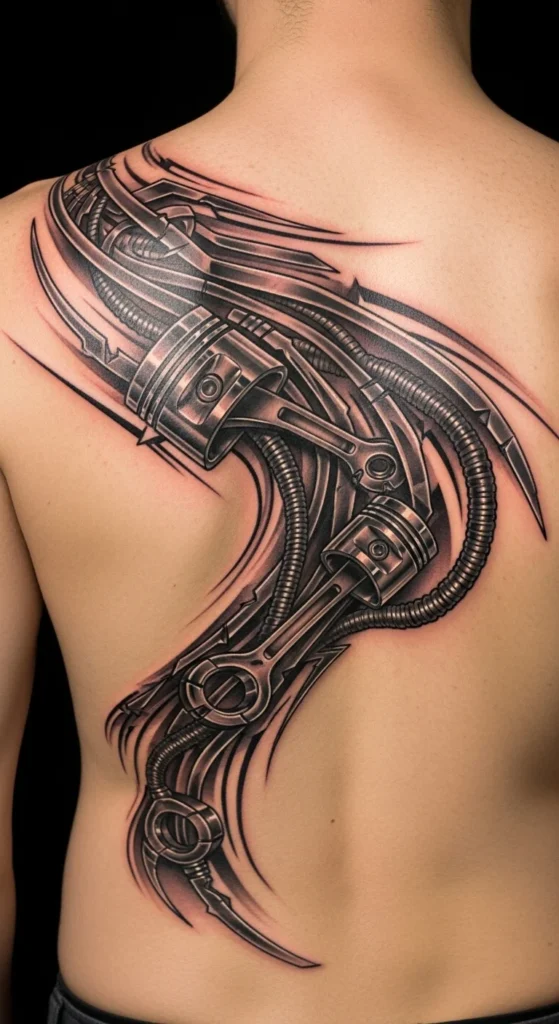 Biomechanical designs look like machinery under the skin. They’re perfect for the flat areas of the back because the 3D illusion reads clearly.