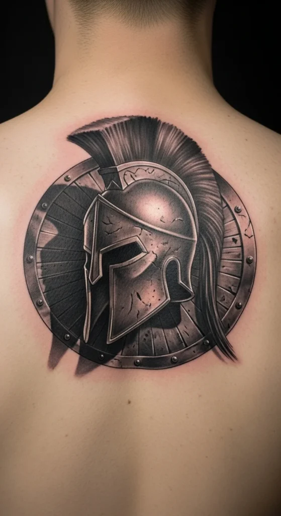 A Spartan helmet is a clean upper-back statement. It’s bold without requiring a full back commitment.