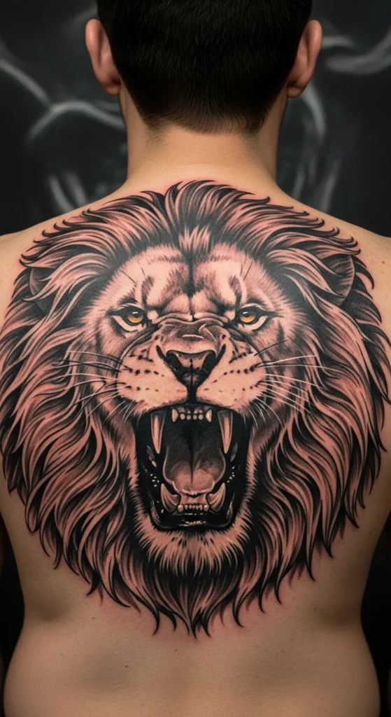 A lion portrait is a classic power move. Put it high between the shoulder blades so the eyes sit naturally.
