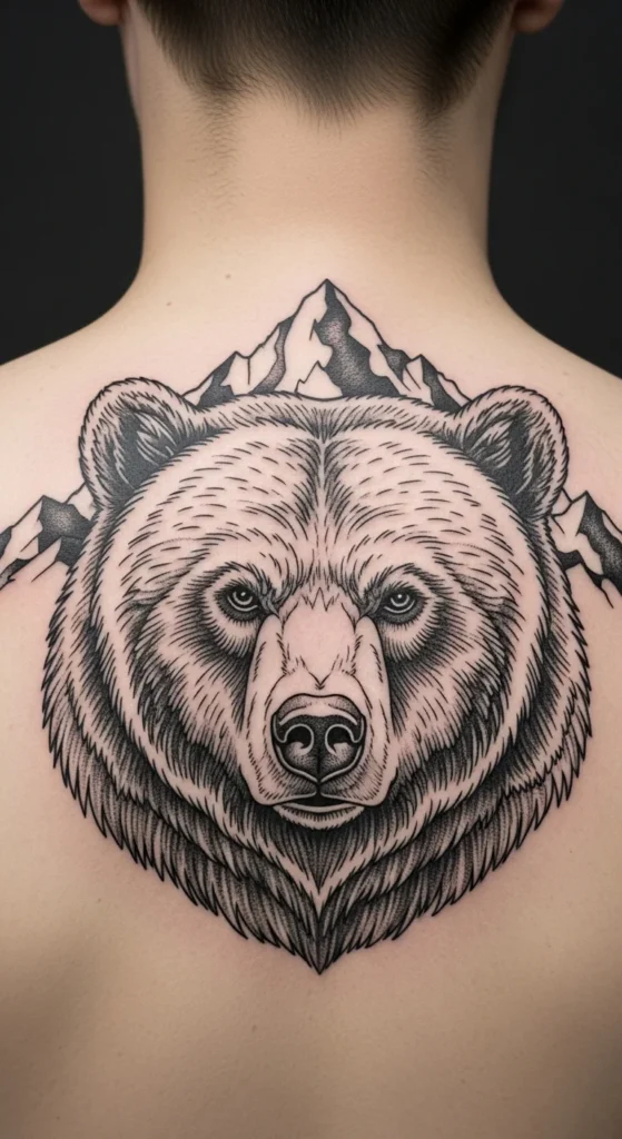 A bear feels heavy and grounded. Pairing it with mountains keeps the theme masculine and clean.