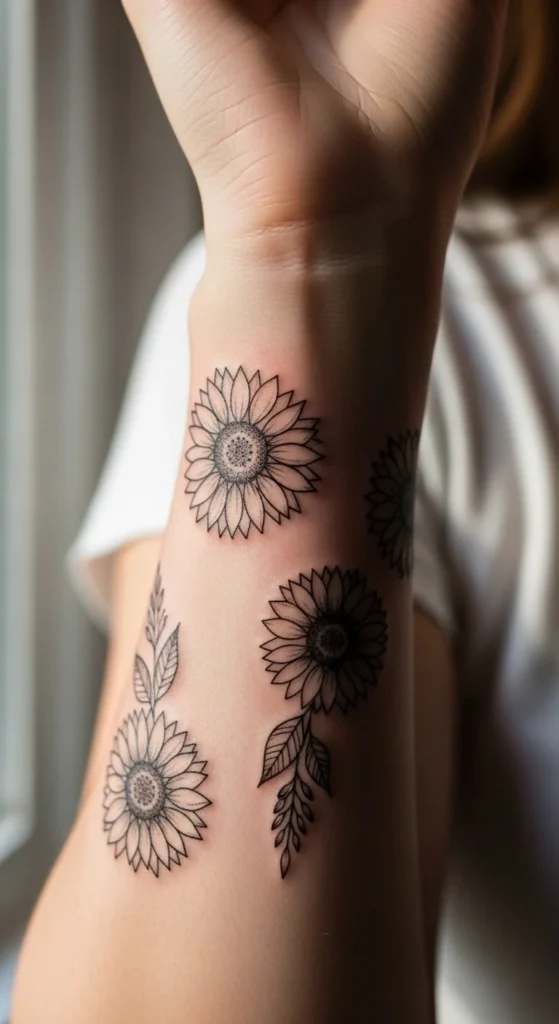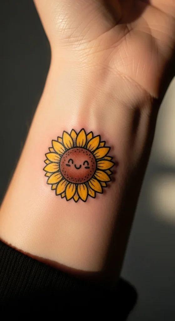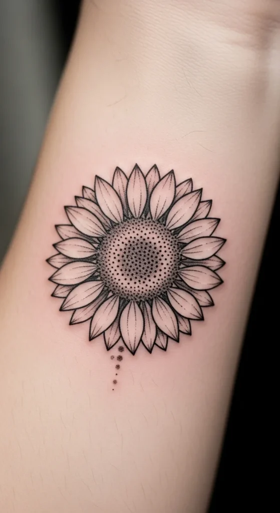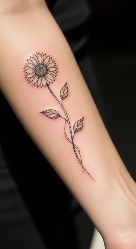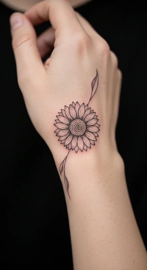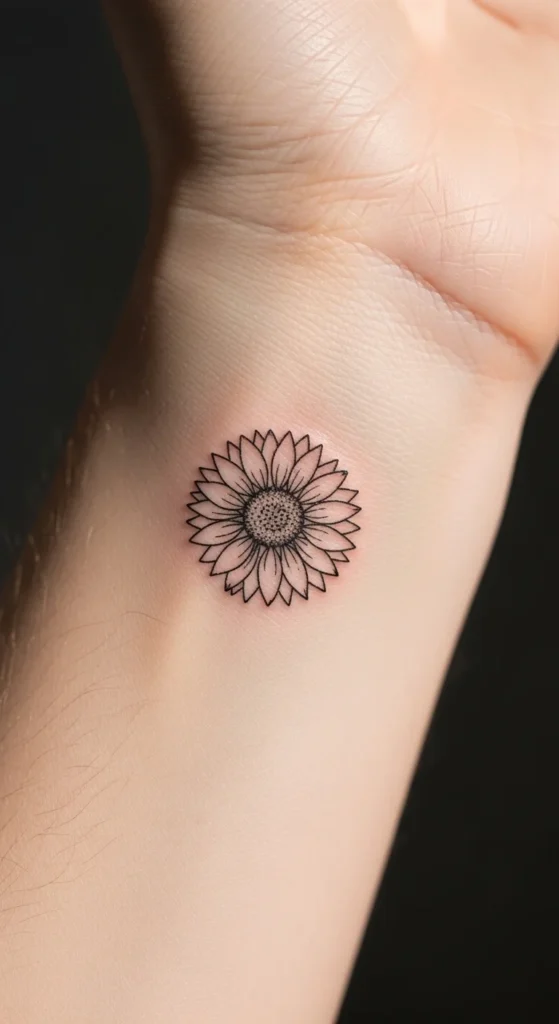 A tiny wrist sunflower is one of the most requested minimalist tattoos. It stays visible without feeling loud.