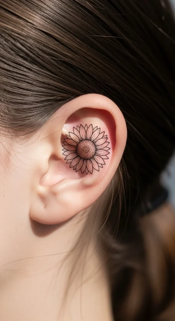 A behind-the-ear sunflower feels playful and subtle. It appears only when hair is tied back.