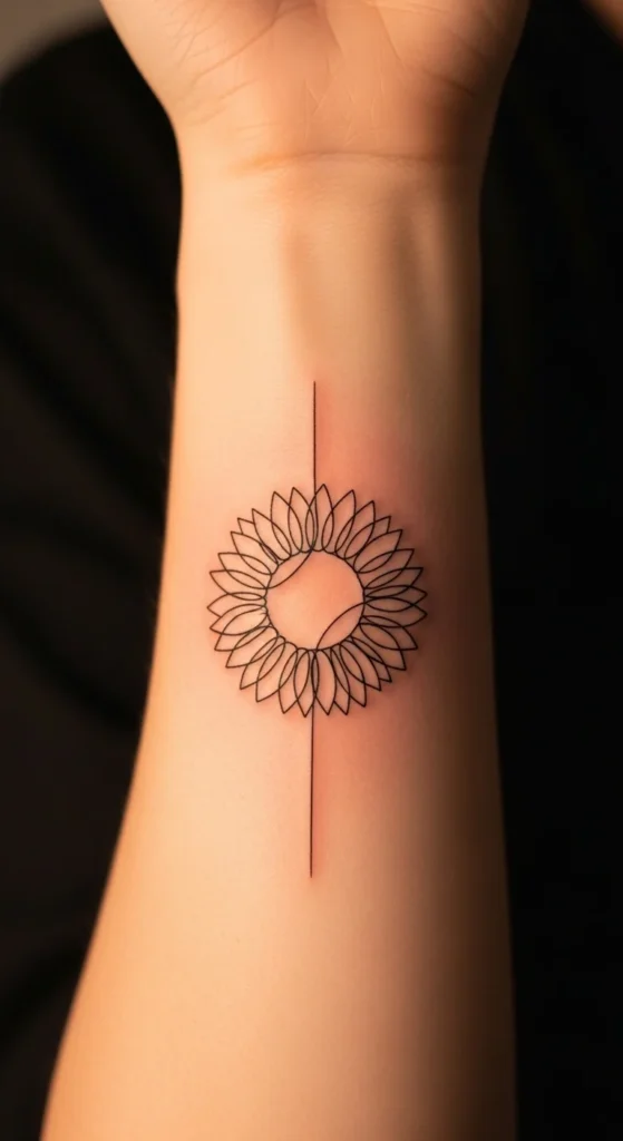 Single-line sunflower tattoos feel modern and artistic. One continuous stroke forms the entire bloom.