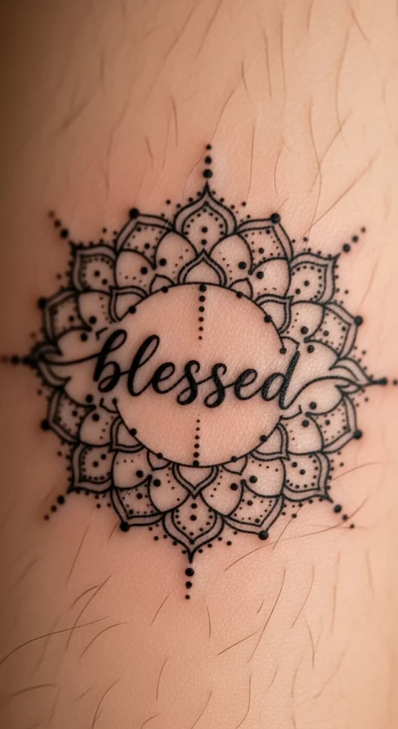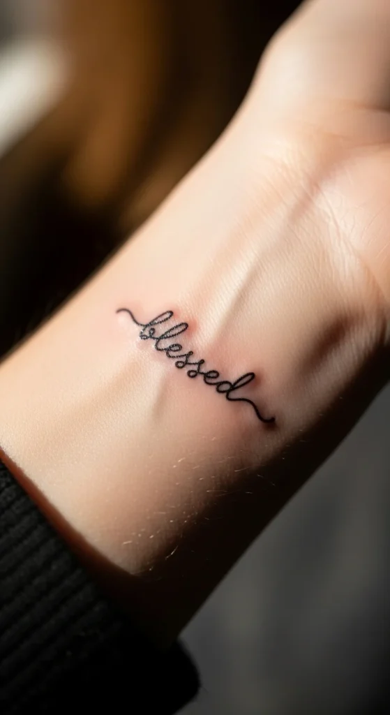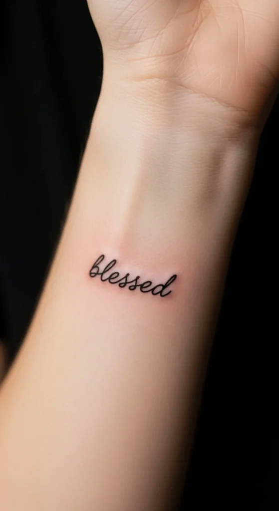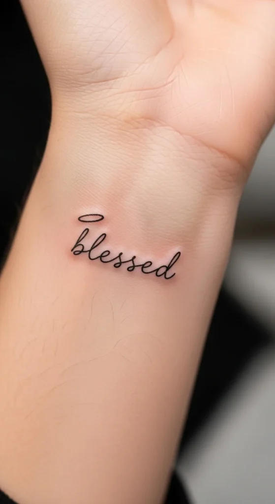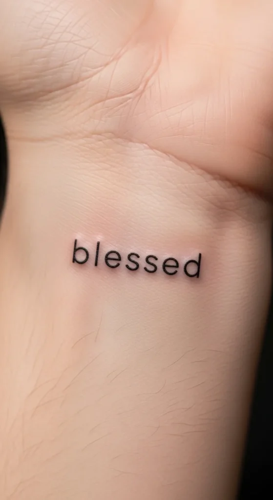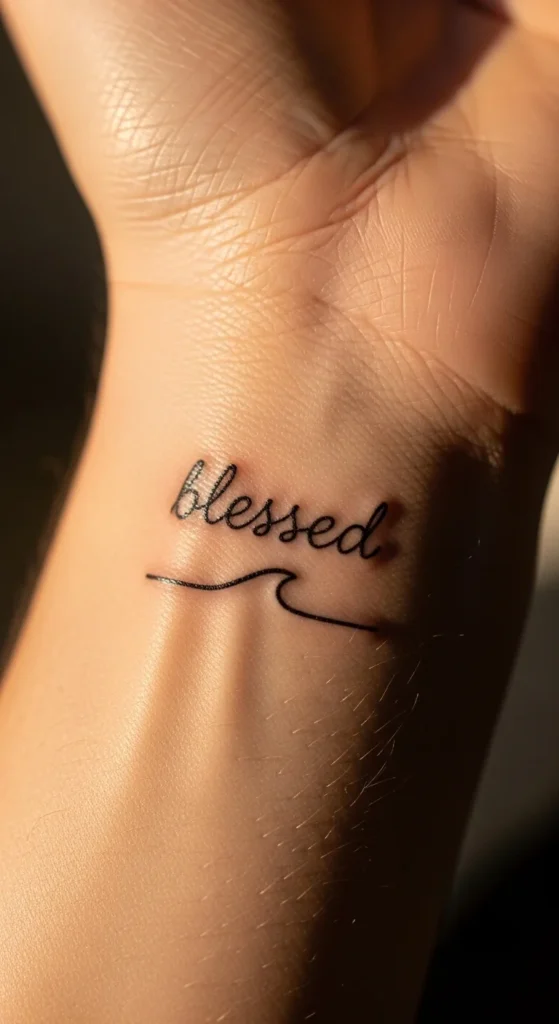 Add sacred geometry for universe harmony symbolism. Keep details minimal to avoid blurring. Side wrist or forearm placement works well. Black ink ensures crisp lines. Pairing with “blessed” creates a unique, subtle design that combines spirituality with art.