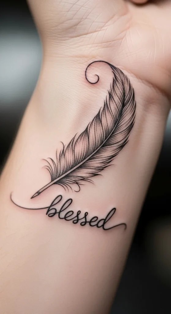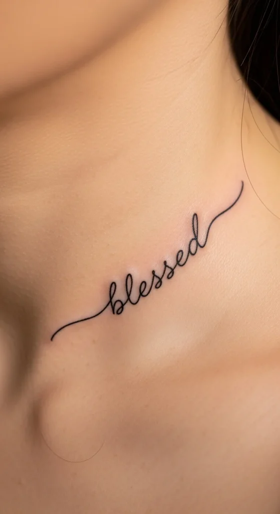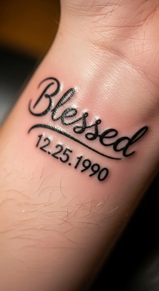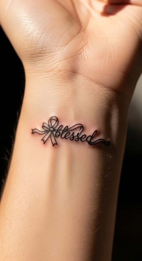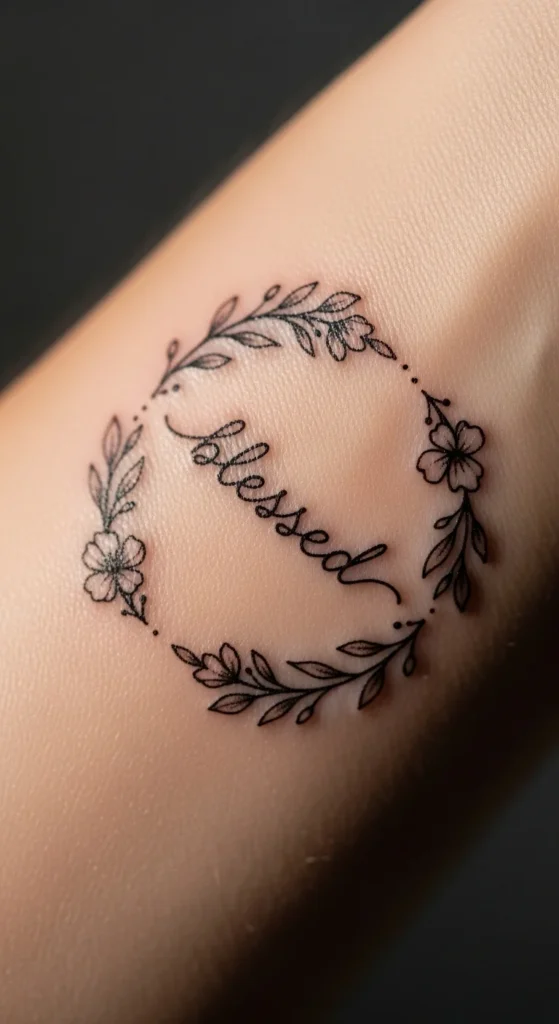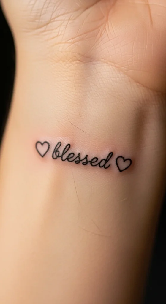 Add sacred geometry for universe harmony symbolism. Keep details minimal to avoid blurring. Side wrist or forearm placement works well. Black ink ensures crisp lines. Pairing with “blessed” creates a unique, subtle design that combines spirituality with art.