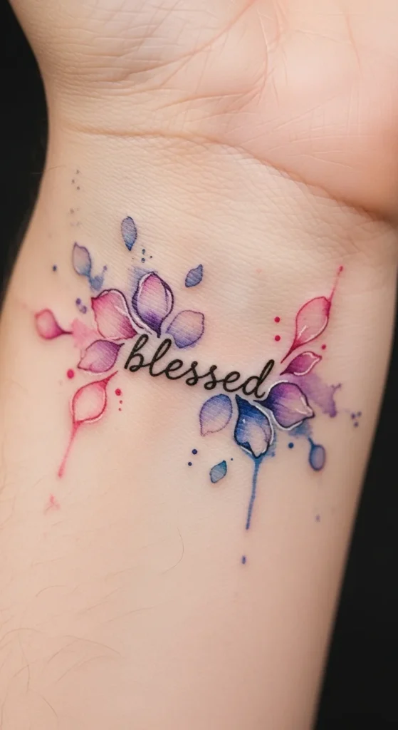 Watercolor adds soft artistic expression. Keep the color subtle for longevity. Fine lines for text and outlines preserve clarity. Side wrist or forearm placement minimizes wear. Temporary pens help trial placement. Perfect for creative, feminine designs.
