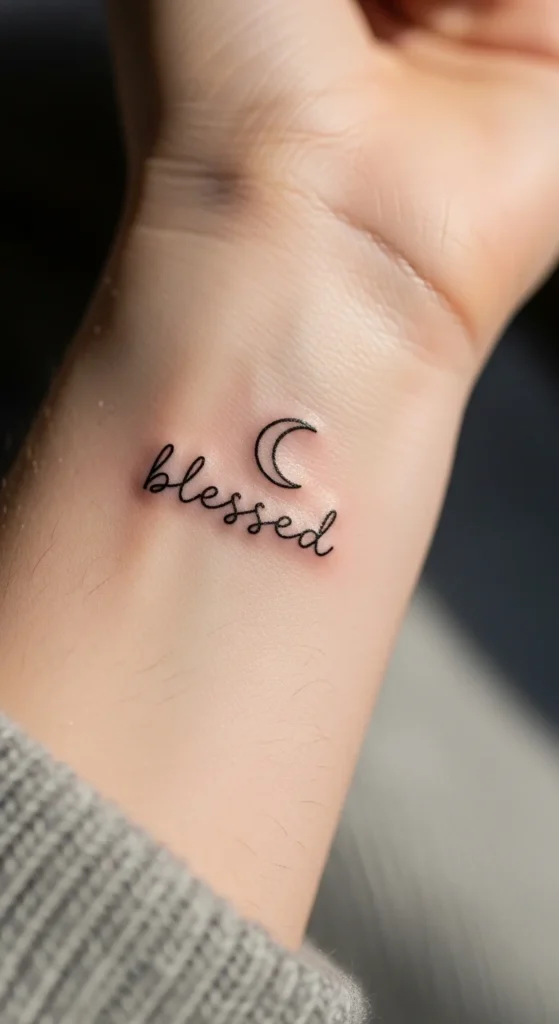 Moon represents cycles and personal growth. Pair with “blessed” in cursive. Black ink preserves clarity. Side wrist or forearm placement reduces friction. Temporary markers assist alignment.