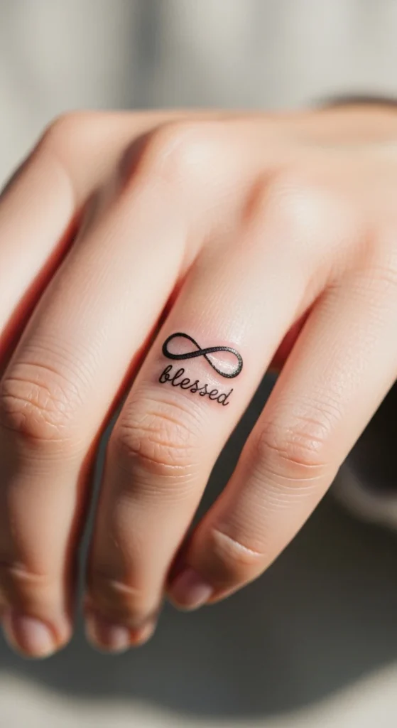 Infinity conveys eternal gratitude or faith. Pair with “blessed” for subtle meaning. Side finger placement preserves ink. Black linework keeps it clear and affordable. Temporary sketches help confirm spacing.