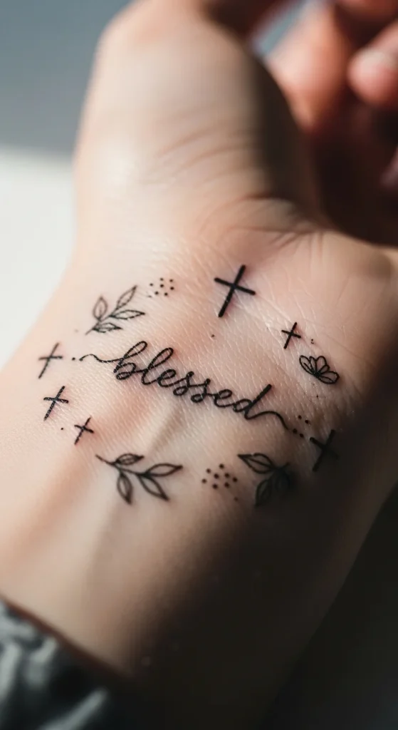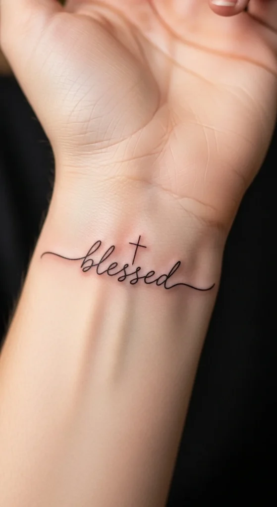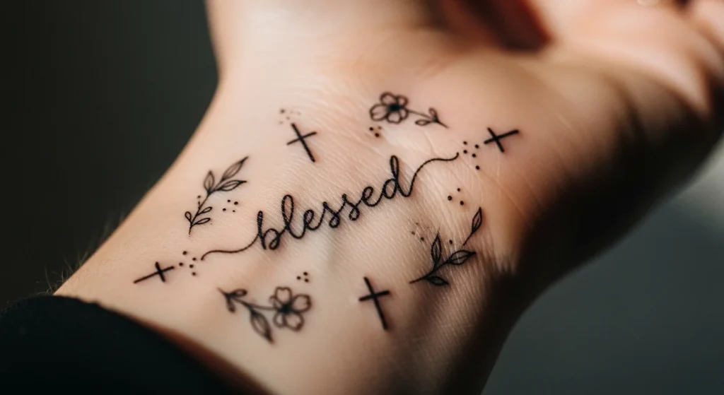 Pairing “blessed” with a cross subtly expresses faith. Side wrist or finger placement protects lines from friction. Keep the cross minimal; black ink lasts longest. Temporary pen sketches help visualize placement. Ideal for first-timers who want a meaningful, small tattoo.