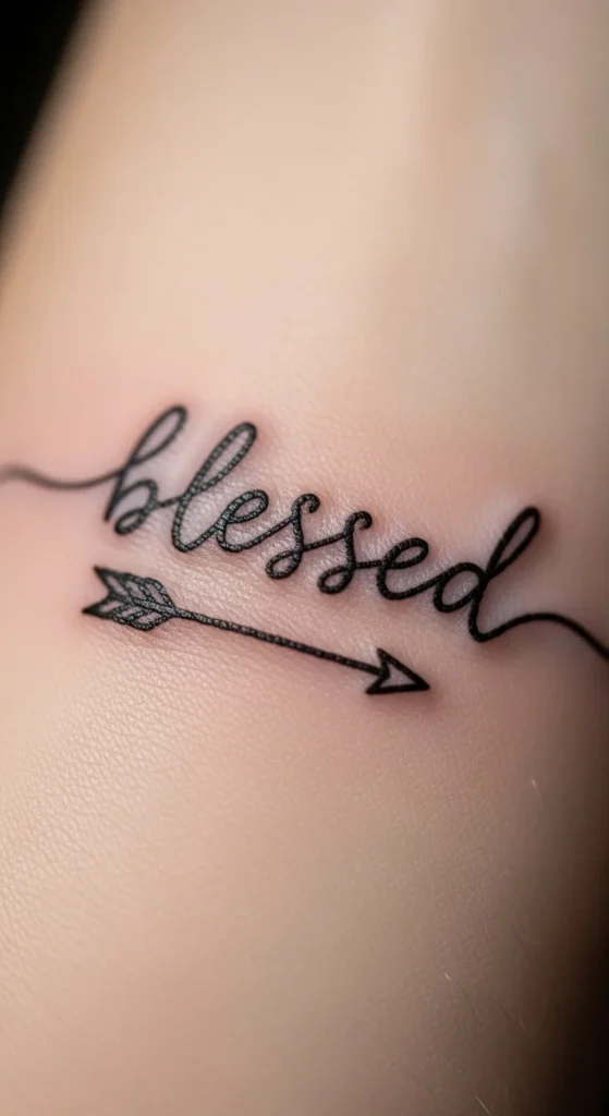 Arrows signify direction and courage. Pairing with “blessed” reflects purposeful faith. Fine-line black ink maintains clarity. Temporary sketches help placement.