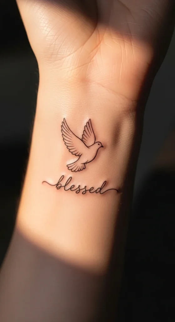 The dove represents peace and resilience. Combine with “blessed” for spiritual depth. Side wrist or forearm placement is discreet. Keep outlines thin; watercolor washes add softness. Temporary sketches allow placement checks. Ideal for faithful yet subtle expression.