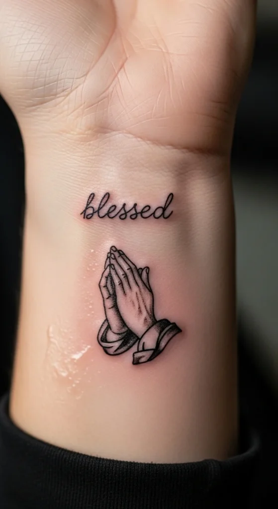 Praying hands show humility and devotion. Place beneath the word on wrist or forearm. Fine-line black ink preserves detail. Temporary pen layout ensures alignment. This pairing balances faith with elegance, creating a meaningful, personal reminder.
