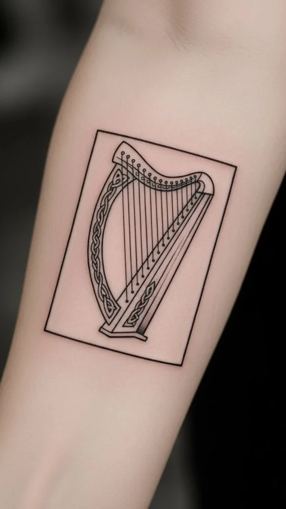 The harp ties directly to Irish heritage. Flash versions often use a clean outline that heals well.