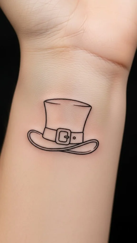 A hat outline keeps the theme playful without being loud. It’s a popular choice for first tattoos.