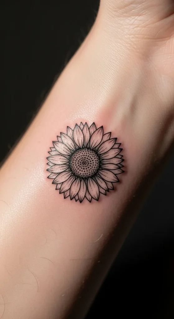 A minimalist fine line sunflower is perfect if you love subtle ink. The thin lines keep the design clean and timeless. It works especially well on the wrist, ankle, or behind the ear.