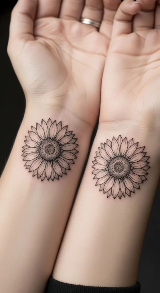 Matching sunflower tattoos are popular for friends, siblings, or couples.