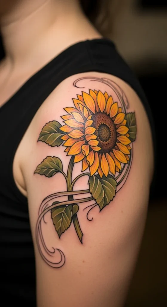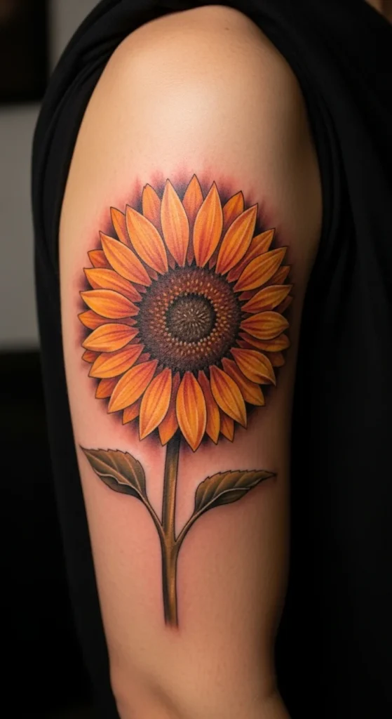 A shoulder cap sunflower follows the body’s natural curve beautifully. It creates a rounded floral look that feels balanced and eye-catching.