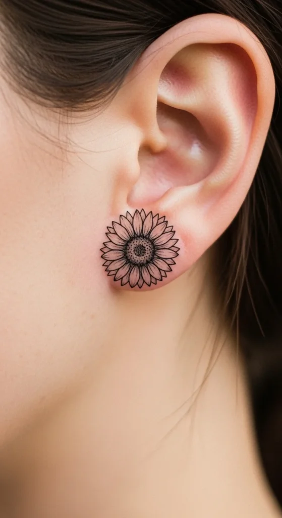 A behind-the-ear sunflower feels subtle and personal. It stays mostly hidden but adds charm when hair is tied back.