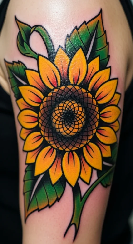 Traditional sunflower tattoos stand out instantly. Thick black outlines and strong colors give this style serious staying power.