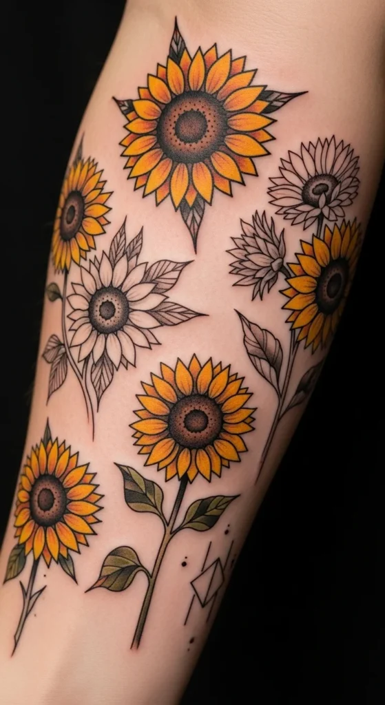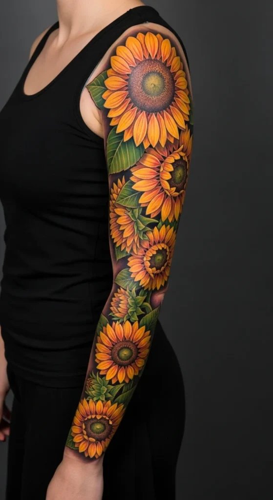 A full sunflower sleeve creates maximum visual impact. Large layered blooms can wrap the entire arm beautifully.