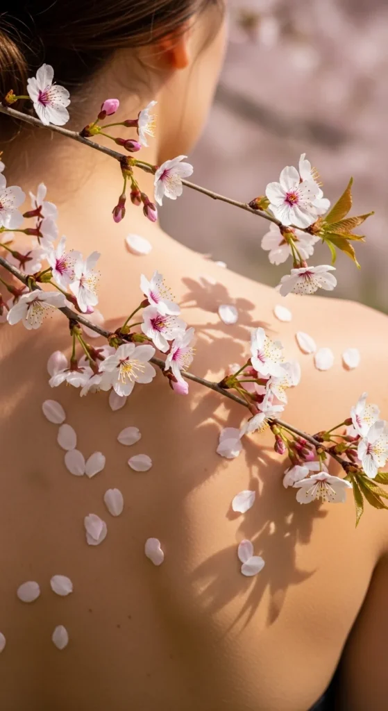 Cherry blossoms feel light and romantic. The petals create gentle movement across the shoulders.