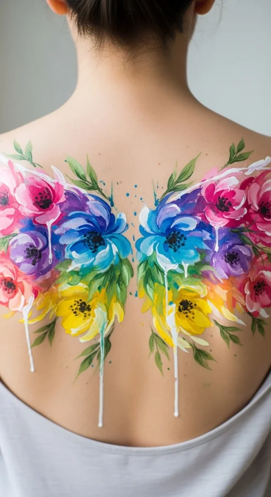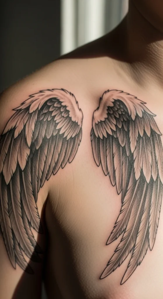 Angel wings spread naturally across shoulder blades. They feel protective and strong.