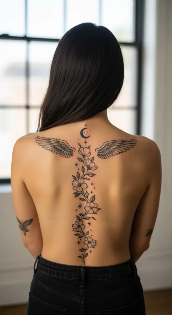 A back tattoo gives you room for art that feels graceful, balanced, and personal. The wide surface allows spine designs, floral climbers, wings, and mandalas to flow naturally with your body shape. You can keep it hidden at work and show it off when you want. The ideas below focus on beauty, comfort, and smart budgeting. Each one includes simple tips so you can plan sessions, save money, and build your piece slowly without stress.